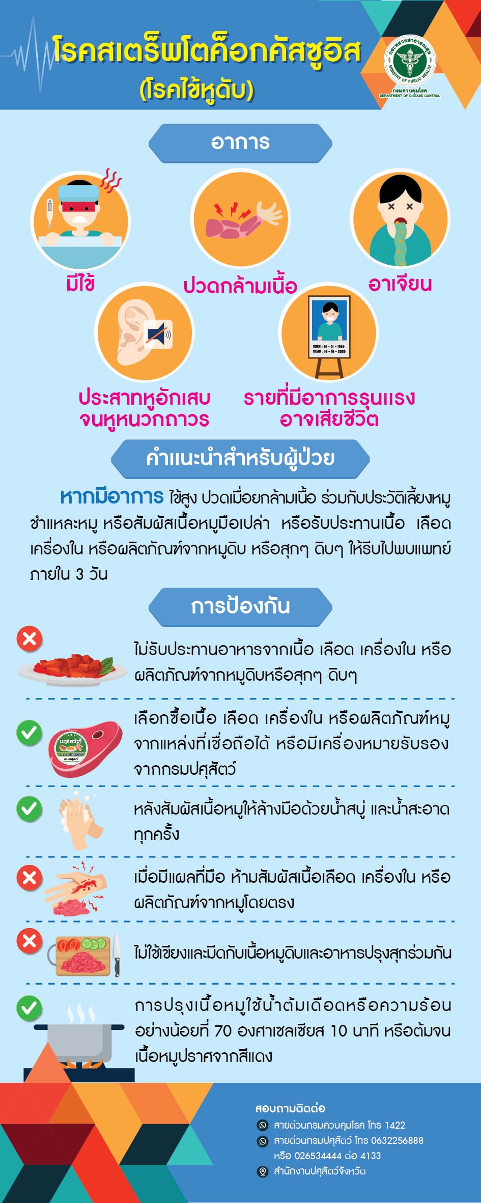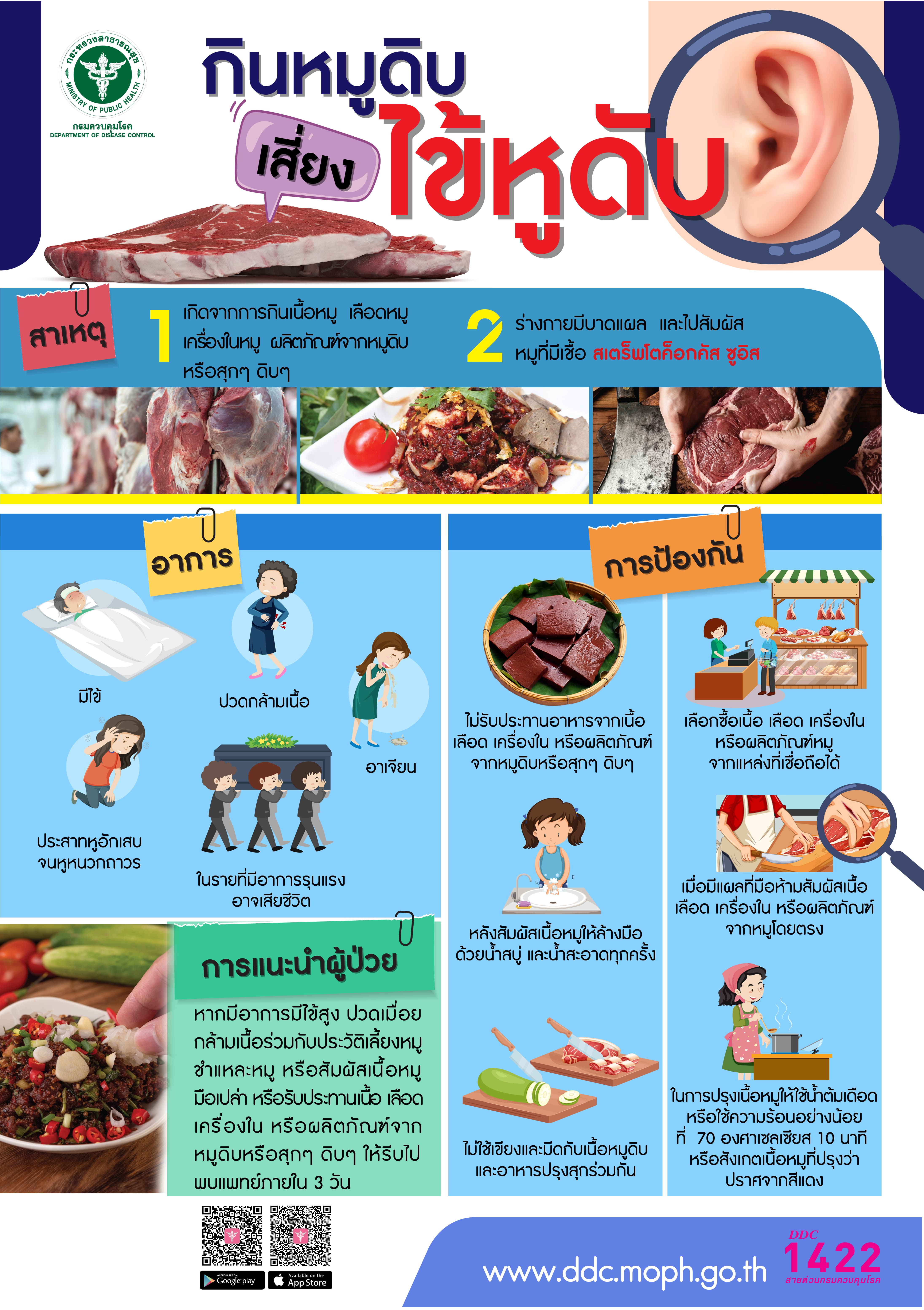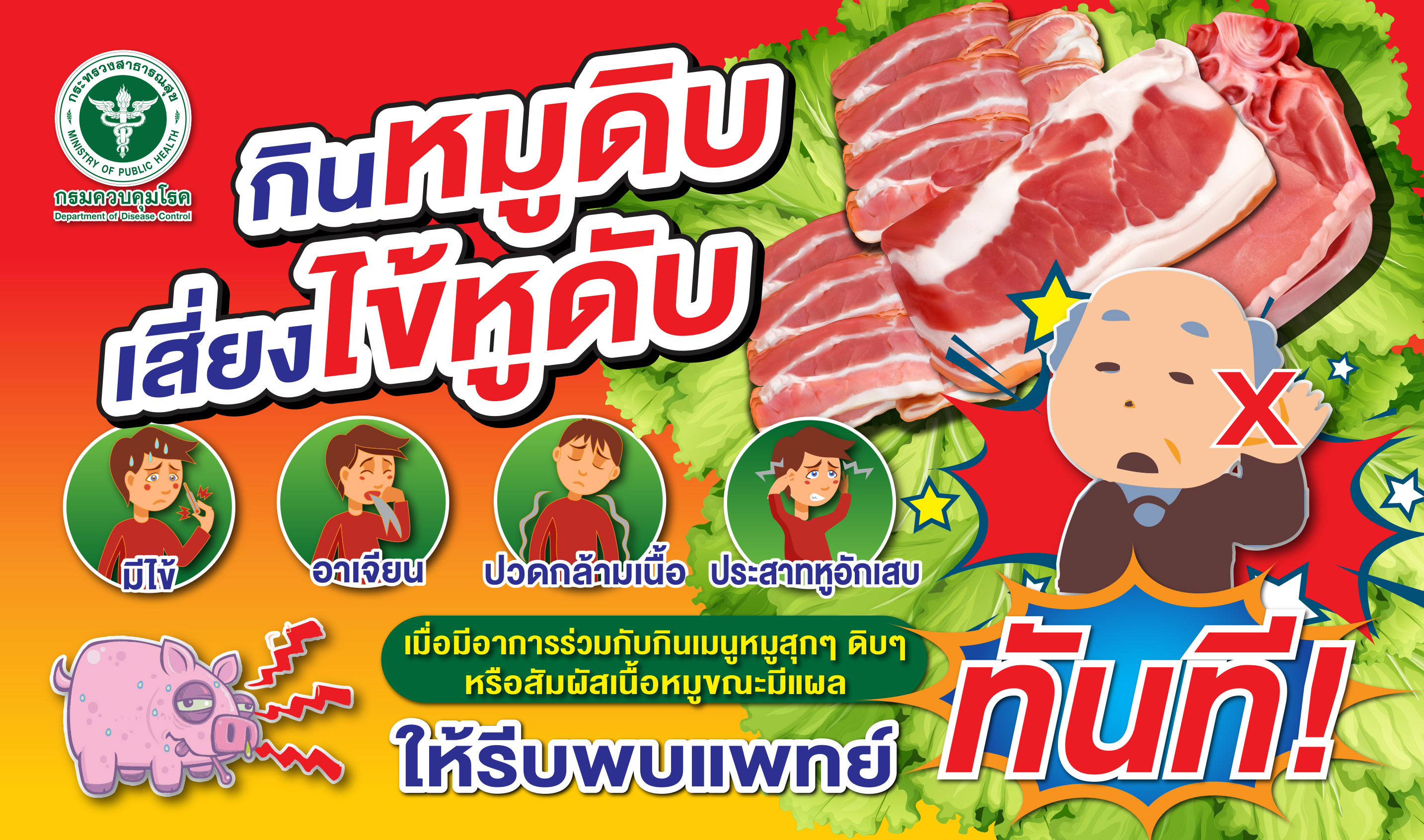 - หากมีอาการ ไข้สูงมากกว่า 38 องศาเซลเซียส มีอาการปวดเมื่อยกล้ามเนื้อ มีประวัติเลี้ยงหมู ชำแหละหมู หรือสัมผัสเนื้อหมูมือเปล่า หรือรับประทานเนื้อ/เลือด/เครื่องใน/ผลิตภัณฑ์จากหมูดิบหรือสุกๆ ดิบๆ ให้รีบไปพบแพทย์ทันที