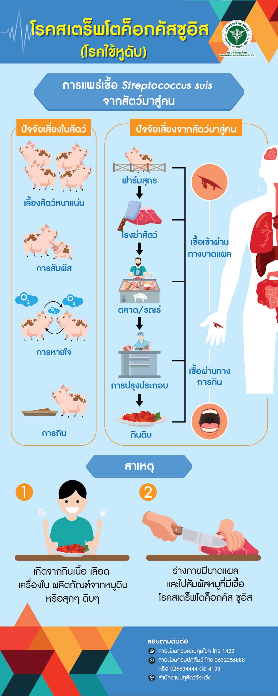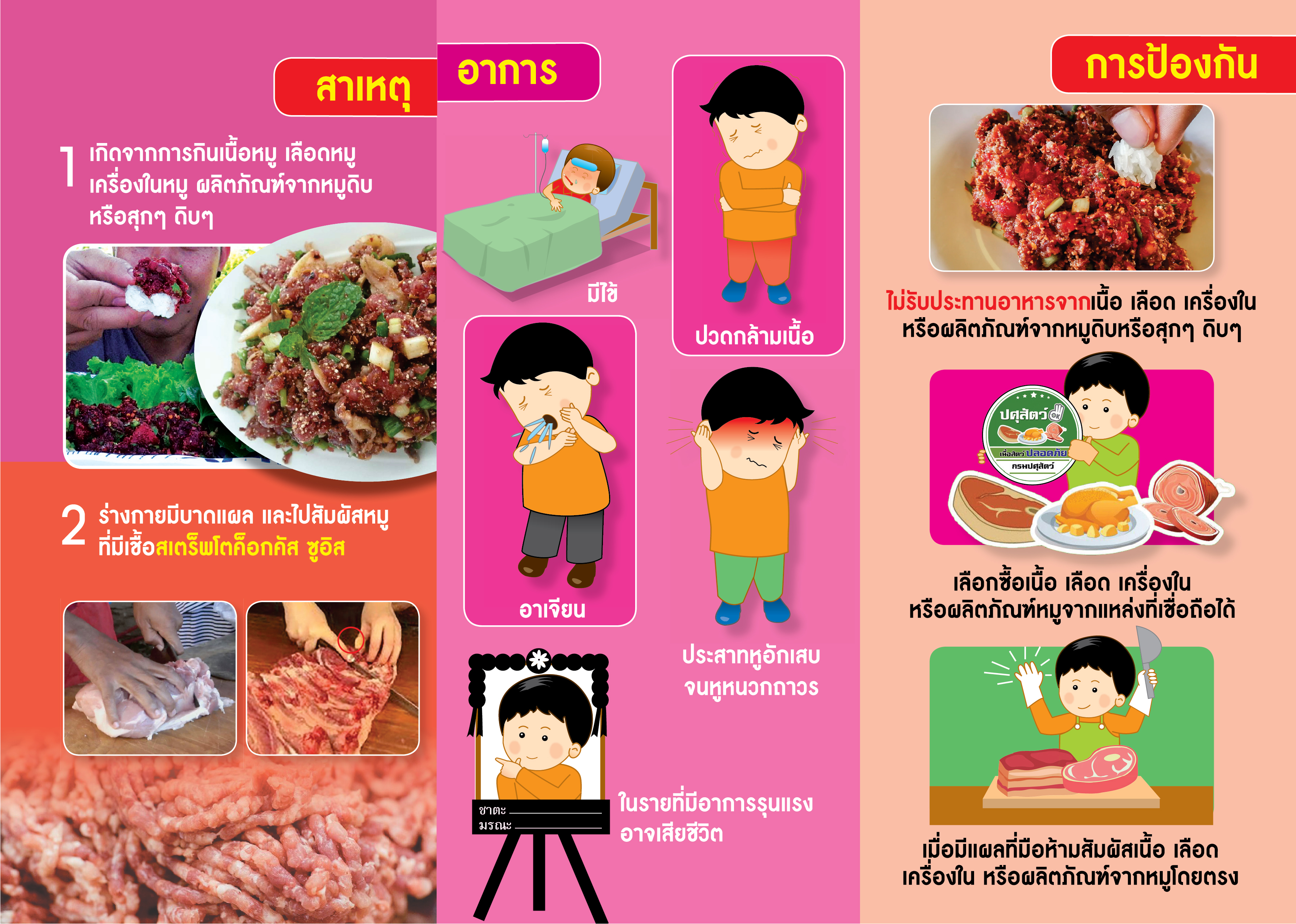 - เมื่อมีแผลที่มือห้ามสัมผัสเนื้อ/เลือด/เครื่องใน/ผลิตภัณฑ์จากหมูโดยตรง